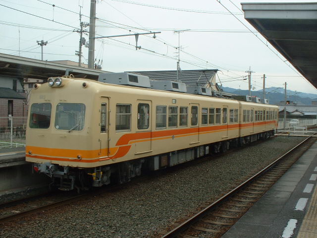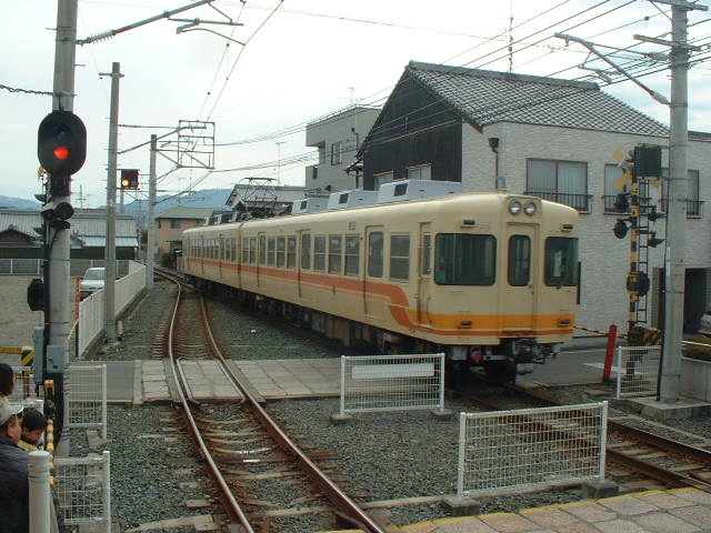 12時15分発松山行きはなんとランプバスでの案内。乗り継ぎ待ちか私より遅い人もちょこちょこいて、若干遅れた。 機内の座席は少し翼にかかるものの窓側を指定していた。しかし、座席に行くと真ん中のB席に小学校低学年くらいの女の子がいて、通路がわに母親らしき人が座っていた。子供であれば窓側のほうがいいかな?と思った私は声を掛けた。結果窓側に女の子、真ん中に母親、通路側に私と言う席順になった。 席に座るとまた眠くなり、離陸はまたまた半分寝ていた。 気が付くとまたまた機内サービスを始めるところであった。ゆっくりとサービスを頂くと同時に、カバンからまたまた「旅のお供」となりかけている日糧の「しっとりあんぱん(こしあん)」を出す。昼食。 松山空港が近くなり、着陸態勢に入る。松山空港は初の利用で、窓外が気になった。ちらっと見てみると、おぉ!走ってる走ってる。伊予鉄。 なかなかいいね。2両編成の電車が走っているのを見るのはなかなか楽しい事だ。 結局松山行きではノートPCは取り出さなかった。 そうして松山空港に着陸。羽田の出発が遅れた上に「向かい風の影響」もあって、なんと着いたのは30分遅れ。ただでさえ短い松山の滞在時間がもっと短くなった。 ターミナルを出ると松山市駅行きと、道後温泉行きのバスが並んで止まっている。道後温泉にも久しく入ってないのでとっても行きたいのだが、やはり時間がない。当初予定通り松山市駅行きに乗る。いつもよりもバスの乗客が多いようで、出発時には立っている人も出た。一日乗り放題の影響だろうか。 ここで携帯に松山在住のまなぐらさんからメール! まなぐらさんとはしばらく会っていなかったのだが、先日メールをちょこっとだけやり取りしたのだ。ちょうど松山に着いたところだったのでタイミングは抜群である。ただ、松山に来る事を告げた自宅からのレスが遅すぎたためか会えなさそうである。 市街まで平坦だと思っていたらいきなりトンネルに二つ入ったのでびっくりした。まもなくしてちょっと混雑している市街に入り、JR松山駅前に着いた。ここで殆どの人が降りてしまった。直行だと思っていた後発の道後温泉行きもJR駅にやってきた。 丁度駅前を出る時に、目の前を「坊っちゃん列車」が走っていった。「坊っちゃん列車」とは、蒸気機関車型の機関車がちっちゃな客車2両を引っ張って走るというものだ。噂によると蒸気機関車に見えて実はディーゼル機関車と言う点と、高すぎると言う料金で不人気らしい。 JR駅前を出てバスは進む。駅前通をちょっと行ったところで伊予鉄郊外電車の高浜線の踏み切り。高浜線には大手町の駅がある。この辺から市内電車の道後温泉行きと併走した。大街道、上一万など懐かしい電停名が思い出される。 バスは無事に松山市駅前に到着した。 伊予鉄の松山市駅は駅ビルの中にある。駅ビルは「いよてつ高島屋」で、昔の「いよてつそごう」である。高松の「コトデンそごう」には天満屋が入ったが、松山には高島屋が入ったようだ。 松山市駅の改札前に行くと、次の電車は14時45分発である。ここからは高浜線高浜行き、横河原線横河原行き、郡中線郡中港行きの三方面に電車が出るが、どれも発車時刻が統一されているようだ。時刻は42分。乗るなら待った無しだ。そこでまず改札の駅員さんに時刻表を貰う。そうして自販機に自宅から持ってきた伊予鉄の「い〜カード」を差し込んでみた。このカードが使われるのは実に5年振りである。それでも磁気情報に異常なく、「投入金額 250円」と出てきた。行きたかったのは郡中線の地蔵町駅である。地蔵町までは350円であったが、250円区間と言うのがあったのでそのまま250円の切符を買った。 改札を抜けて地下道をくぐって郡中線ホームに行く。高浜線と横河原線は直通運転だが、郡中線だけは折返し運転である。 止まっていたのは元京王5000型の700型であった。他に伊予鉄には元京王2000型の800型、自社発注のステンレス車610型、旧型の300型が在籍している。しかし300型はここ2年ぐらい動いていないというのをネットで知っていた。 700型の車内に入ると、結構古臭さが目立った。一週間前には高松の琴電で同じ元5000型の1100型に乗っているが、そっちのほうが綺麗だった。というより京王時代から車内化粧板等の張替えをしていないようだ。 45分になり発車。ちょっとだけ高浜行きと併走したが、すぐに分かれる。郡中線は住宅街の中を抜け、県道らしき道と併走するというなかなか地方私鉄らしい線路を走っていた。 なぜ松山で、なぜ郡中線の地蔵町かと言うと、手元にある雑誌「鉄道ファン」に乗っていた「頑張っています大手私鉄の中古車たち」とかいう昔の特集の「京王編」の扉写真にその「地蔵町駅」が載っていたからである。写真を見る限りでは、対向式ホームのいい感じの駅に見えた。そこで「今作っているレイアウトセクションの参考にしたい!」と思ったのである。なかなかそれだけの理由