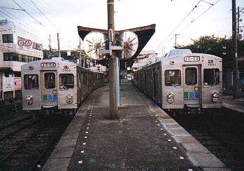 元東急7000系の弘南鉄道の電車。最近は赤帯を青色に変えている。右奥に見える電車は青帯。(弘南大鰐駅にて)